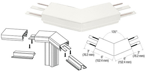 CRL 200 Series Horizontal Corners are fabricated, finished, powder coated and individually packaged. This interior slip-fit corner is designed for 135º corner conditions that allow for a hairline joint in the straight sections of the railing without having to miter cut angles in the field. Attach the Corners using CRL Cat. No. TEK1 Tek Screws.