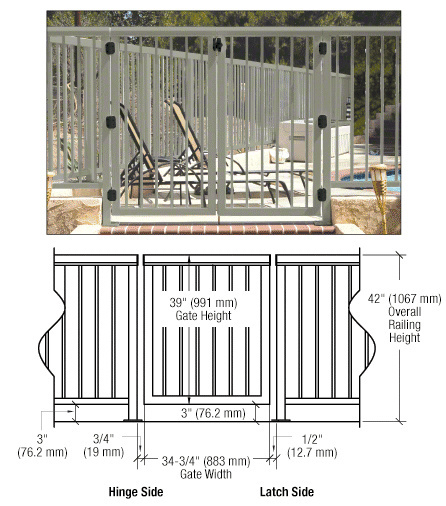 CRL offers a wide selection of Stock Size Gates for our Aluminum Railing Series. They are available in both glass and picket applications in seven standard colors. Gates come fully fabricated, powder coated, and assembled to fit a standard 36" (914 mm) wide opening by 42" (1.07 m) standard railing height. Custom gate sizes are also available.